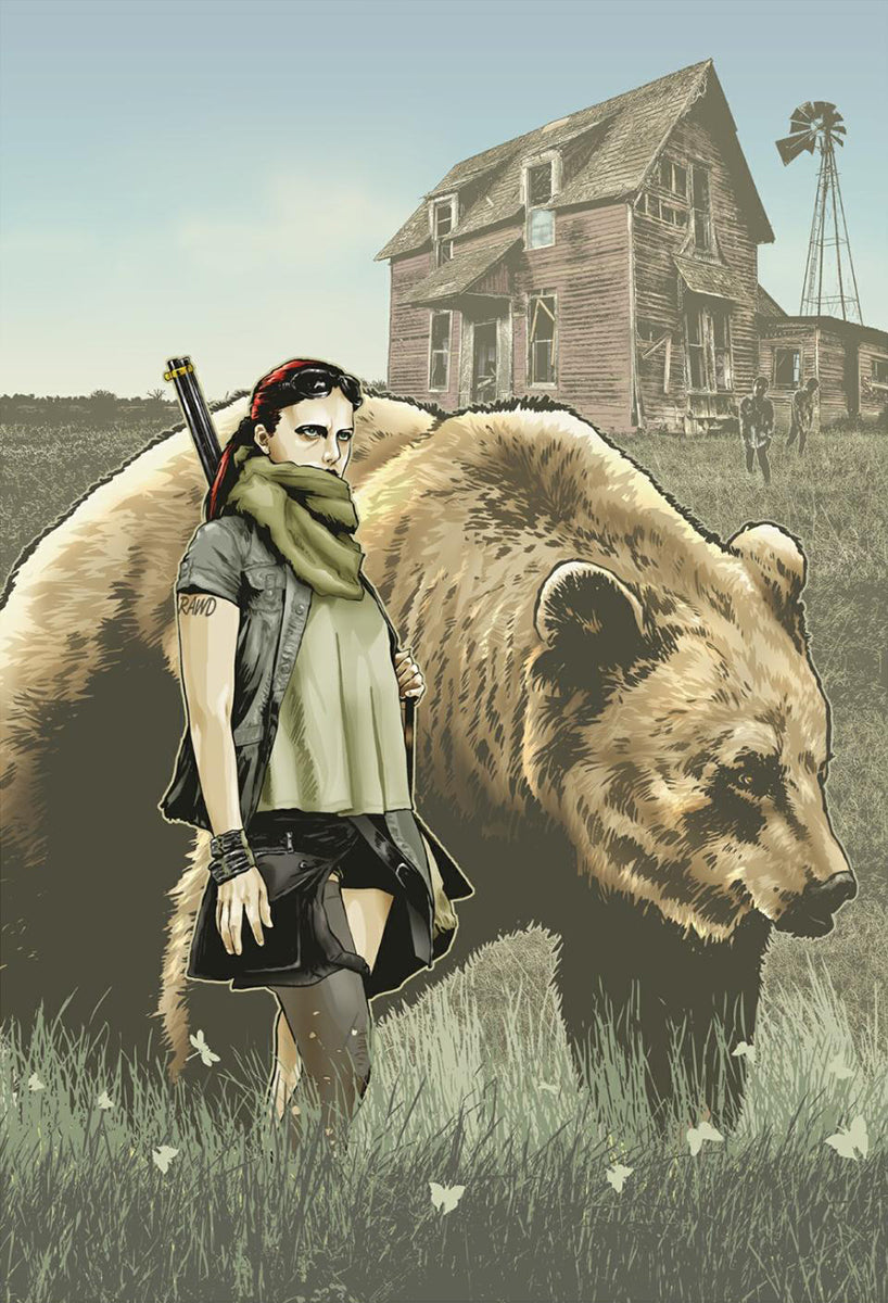 Step into a bold world where survival meets loyalty with this daring print featuring an original illustration of a fearless woman and her formidable bear bodyguard amid a zombie apocalypse. This striking artwork captures strength and protection, making it a captivating addition to any space craving a touch of adventure and resilience.